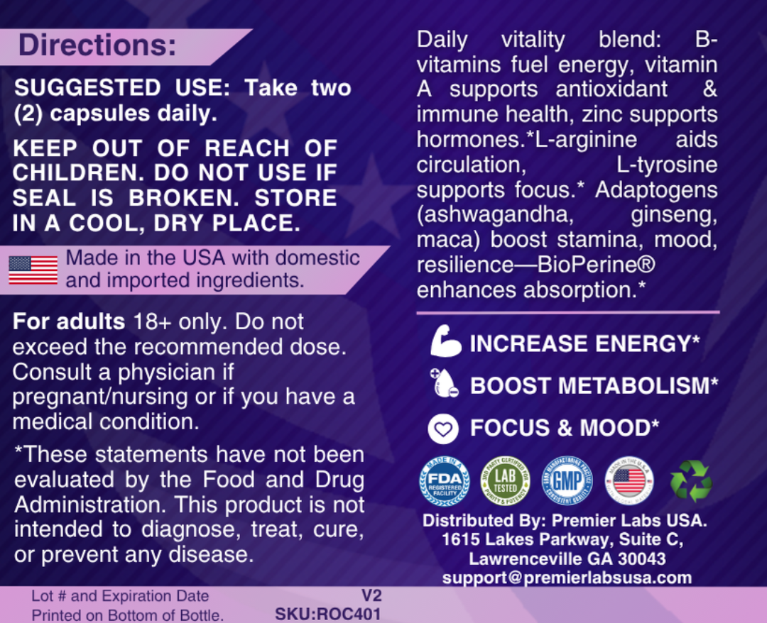 Unleash your natural drive with a powerhouse blend of time-honored botanicals and performance nutrients. Epimedium, tribulus, maca, muira puama, and damiana support healthy libido and stamina, while Panax ginseng, ashwagandha, and L-tyrosine help sharpen focus and tame everyday stress. L-arginine promotes circulation for on-demand performance, and essential B-vitamins plus zinc fuel energy metabolism and hormonal balance. Enhanced with BioPerine® for better absorption, this formula helps you feel confident, energized, and ready to perform—day or night.*