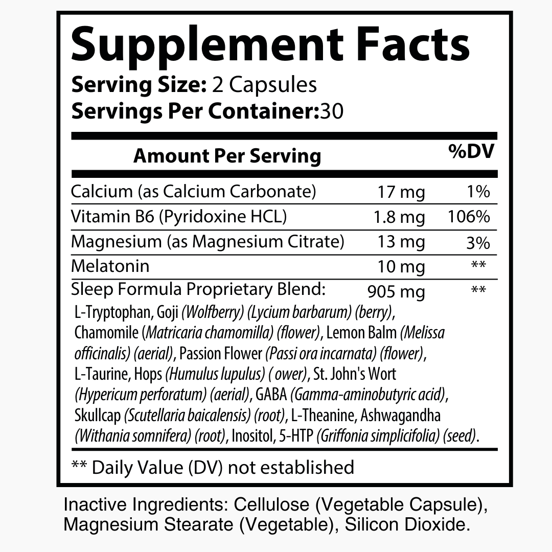 Our advanced formula combines Melatonin, L-Tryptophan, and GABA to help regulate your sleep cycle and relax your nervous system. A soothing herbal complex — including Chamomile, Lemon Balm, Passion Flower, and Ashwagandha — supports tranquility, reduces nighttime stress, and quiets the mind for a peaceful night’s rest. Meanwhile, Magnesium, Calcium, and Vitamin B6 contribute to healthy neurotransmitter balance for optimal relaxation.